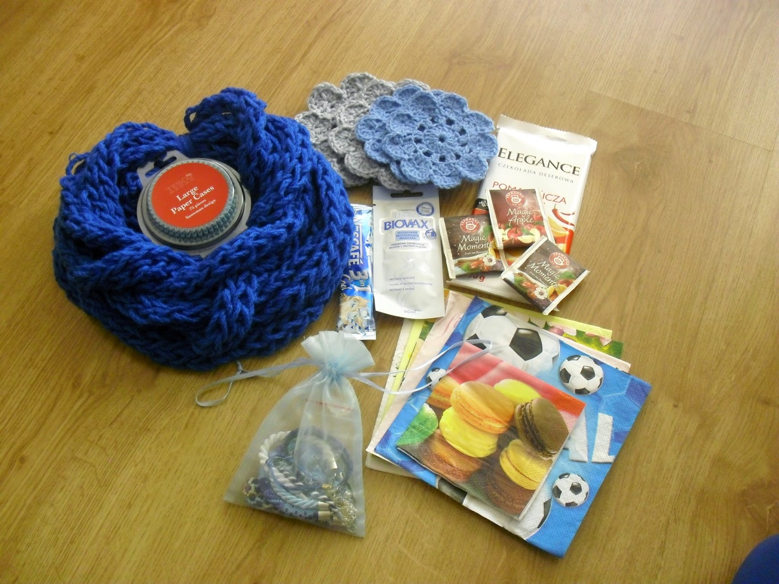 Kobaltowy komin (w końcu miało być zimowo ;)), podkładki pod kubki oraz garść biżuterii, która schowała się do woreczka.